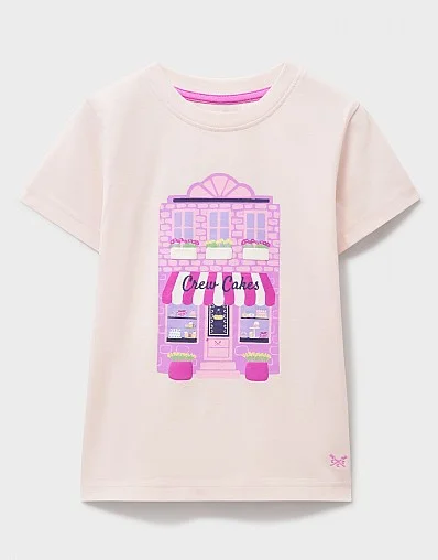 A short sleeve graphic t-shirt in pink. We designed this tee to slot into her spring and summer wardrobe perfectly, with a floral watering can motif on the front, and our crossed oars neatly embroidered on the hem. A pair of dungarees would look oh-so-cute over the top of this.